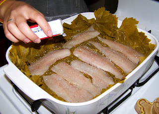 2. In a large baking dish (big enough to lay all your filets flat in one layer), cover the bottom and sides with half of the grape leaves, glossy side up.
